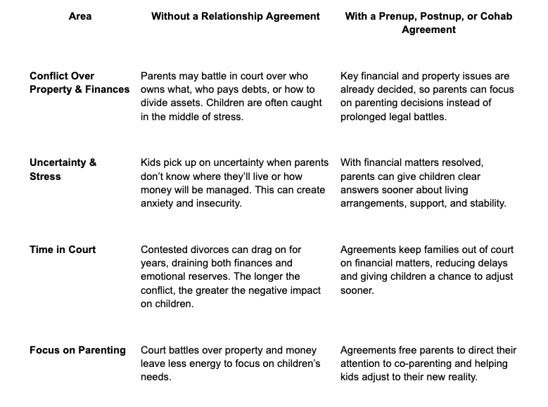 When parents separate, the process can either be managed with clarity and cooperation — or it can spiral into a contested, high-conflict divorce. Research shows that it’s not separation itself but the level of conflict between parents that most affects children’s well-being. The more uncertainty and fighting there is over money, property, and support, the harder it is for kids to adjust.That’s where relationship agreements — prenups, postnups, and cohabitation agreements — make a difference. By setting out how property, debt, and financial responsibilities will be handled if the relationship ends, these agreements give parents a roadmap. Instead of spending months or years fighting in court, families can move more quickly into a new routine.